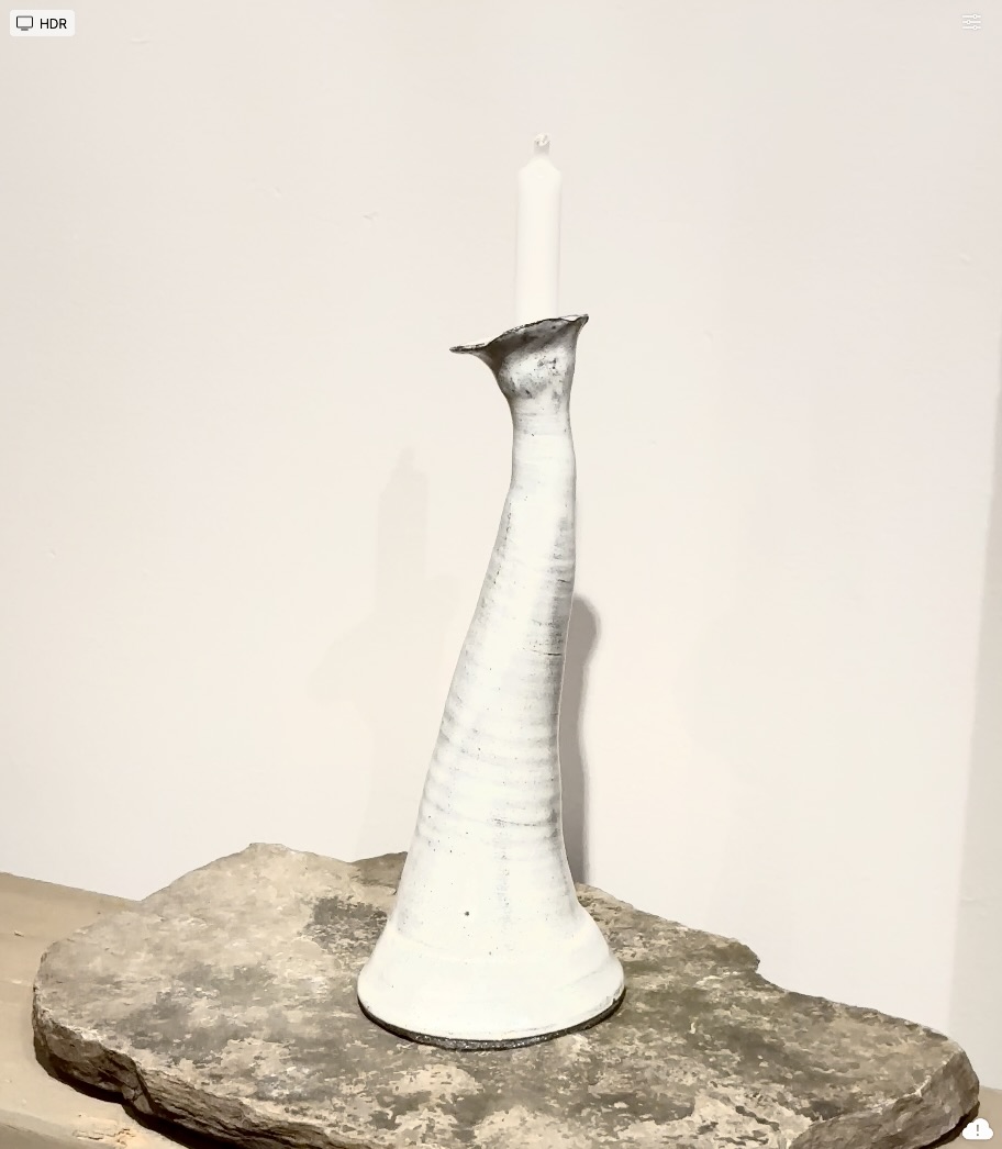 Tall, pale, and ever so slightly off-balance — The Swooner leans into the light with effortless grace. This elegant candleholder stands on solid ground while its top does whatever it wants. Handbuilt clay, glazes.